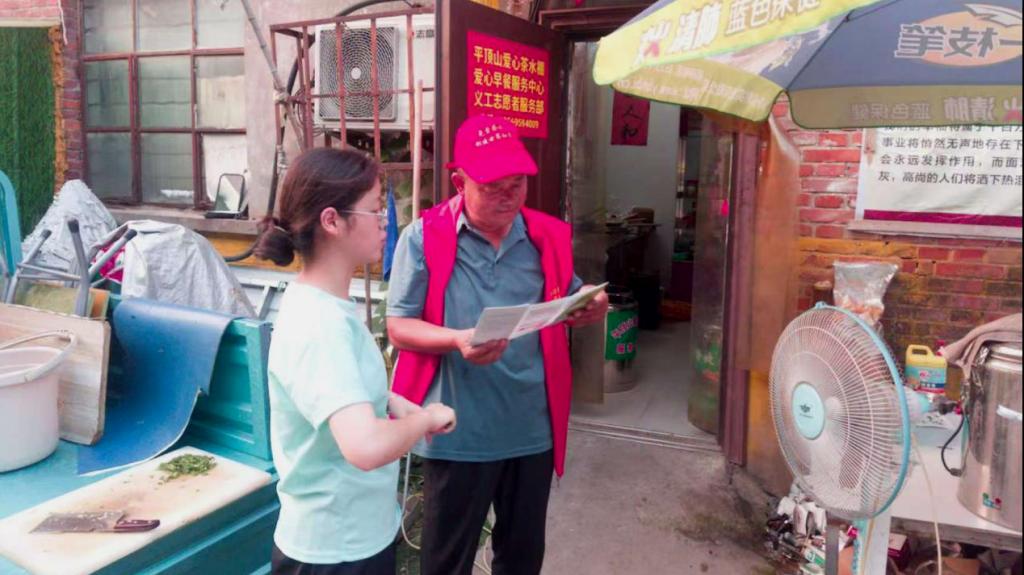 推普暖粥香,声暖新华早。7月28日至8月2日,“语润心乡”推普实践队面向贫困的中老年人群在新华区建设街道开展首场“推普+爱心服务”助力活动,将普通话推广与公益温暖深度融合。清晨5点,晨光还未穿透薄雾,我们已忙碌在爱心粥棚的后厨:清洗食材、清点器具、熬煮热粥,高效配合里满是整齐划一的温暖默契。6点整,热乎的爱心饭菜准时到达,每日称粥前实践团成员会与大家齐声朗读“推普小标语”