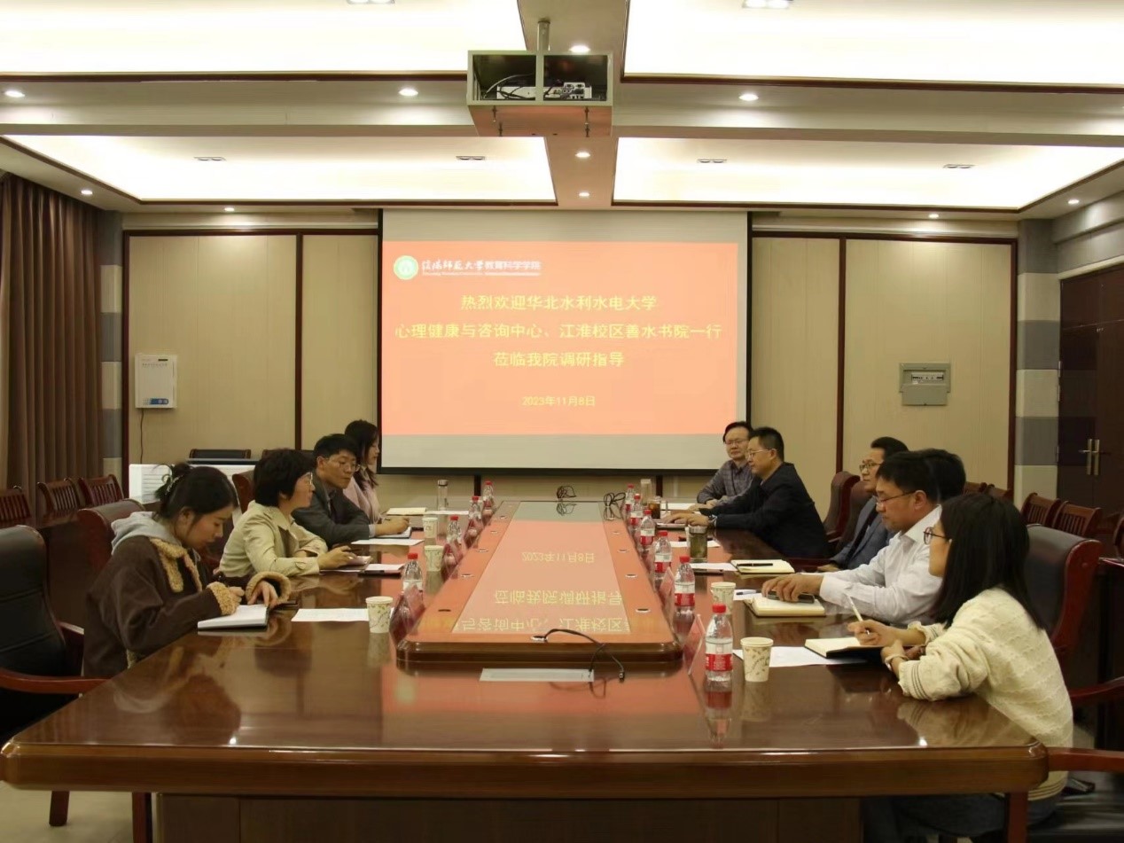 华北水利水电大学心理健康与咨询中心、善水书院来公司调研交流时间:2023-11-09 11:41:19 来源:伟德伟德新闻宣传中心 作者:吴宇熙 祐亚菊 阅读: 次11月8日,华北水利水电大学心理健康与咨询中心主任宋凯果,善水书院经理车华,心理健康与咨询中心张丽娅,善水书院心理二级站李迅仪一行来公司调研交流。校老员工心理健康辅导中心主任、学工部副部长李贵杰,教育科学公司党委书记房加帅,党委副书记董银银,副经理郭勇、孙天义,团委书记牛洁楠出席会议。会议由房加帅主持。  会议伊始,房加帅对宋凯果一行的到来表示热烈欢迎,并简要介绍了伟德的基本情况。李贵杰从心理健康教育课程建设、人员配备、经费投入、心理咨询及相关活动等方面介绍了公司心理健康教育工作的现状与经验。车华简要介绍了华北水利水电大学江淮校区的情况。宋凯果围绕江淮校区老员工心理教育咨询工作进行了交流,希望与公司在心理健康教育、心理学专业员工实习实践等方面深入合作。会后,宋凯果一行现场参观了公司老员工心理咨询中心。 本次座谈会推动了两个单位之间的交流与合作,加强了对心理健康教育工作的认识和了解,进一步促进了心理健康教育工作的持续发展。 编辑:吴宇熙 祐亚菊 审核:杨艺卓 摄影:刘璐 郭霄霄