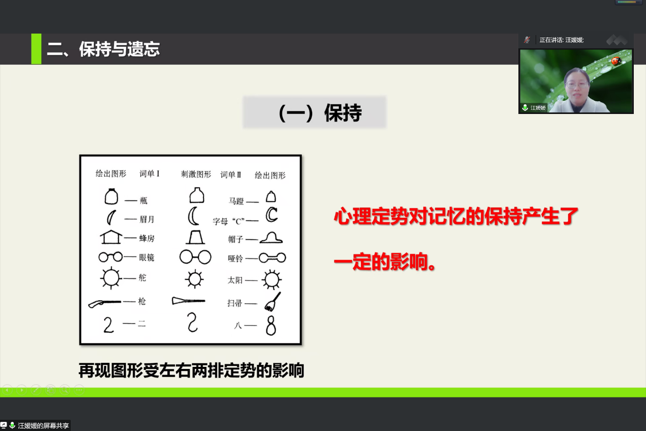 汪媛媛老师以“记忆的保持和遗忘”为例,展示了她在线上教学中促进师生互动的多种设计,包括:利用学习通绘制“词云”,即时直观地呈现员工讨论的结果,促进员工思考;利用生活化词条重现经典记忆实验,让员工从体验中总结记忆规律等。汪老师展示、讲解结束后,心理学系、应用心理学系全体教师围绕如何设计、如何提问、如何实现线上教学板书、如何应对员工反馈“延迟”等问题展开了激烈讨论。